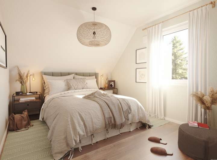 Das Flair 113 ist nicht ohne Grund das meistgekaufte Town & Country Haus. Es bietet alles, was ein Massivhaus gemütlich macht. Im Erdgeschoss betreten Sie ein geräumiges Wohn- und Esszimmer, eine Küche mit genügend Freiraum, ein Gäste-WC und einen Hauswirtschaftsraum mit ausreichend Platz für Waschmaschine und Co. Im Dachgeschoss erwarten Sie neben drei weiteren geräumigen Zimmern ein komfortabel ausgestattetes Badezimmer.