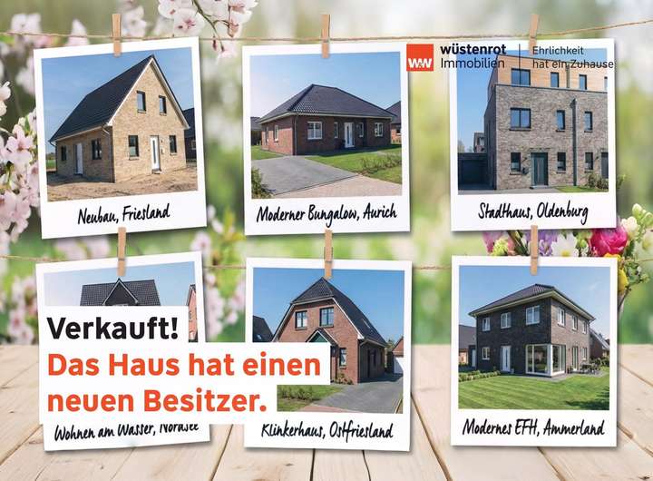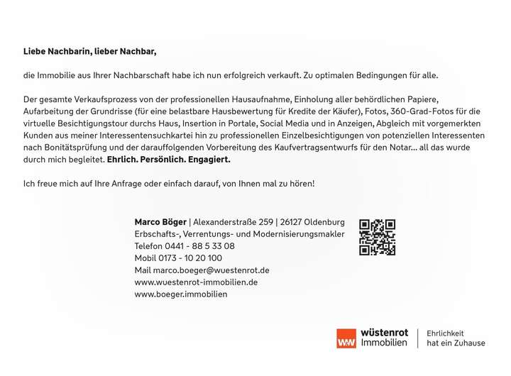 *Hinweis: Die Grunddaten/Immobiliendaten dienen zur Illustration dieser Werbeanzeige. Es wird kein Haus verkauft. Diese Werbung informiert Sie über unseren Service der kostenfreien Immobilienbewertung bei Vermarktung und Vertragsabschluss eines Makleralleinauftrages zum Verkauf Ihrer Immobilie von Wüstenrot-Immobilien Marco Böger, Alexanderstraße 259, 26127 Oldenburg.