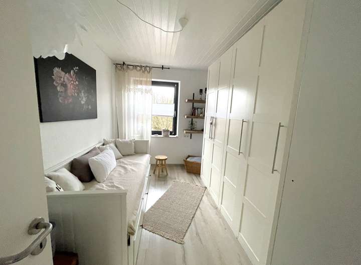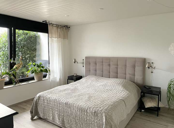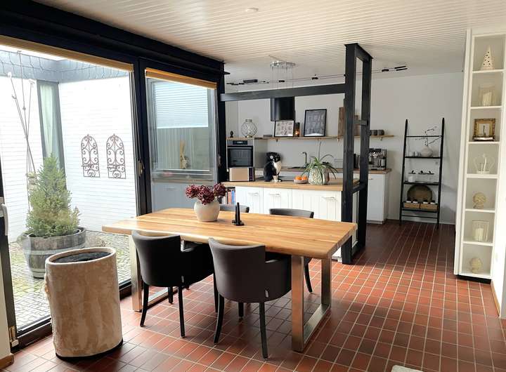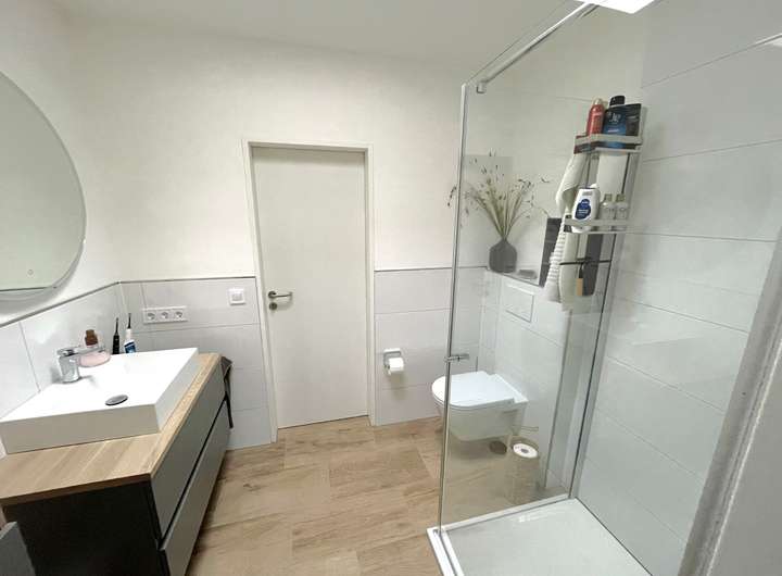 Die Küche ist aktuell mit einer maßangefertigten Küche aus 2024 ausgestattet und führt direkt in die Waschküche, die zusätzlich mit Badewanne, Waschmaschinen- und Trockneranschluss ausgestattet ist. Der angrenzende Heizungsraum ist bequem auch von außen erreichbar. Das Badezimmer mit Dusche sowie das Gäste-WC wurden 2025 renoviert. Zudem erweitert eine durchgängige Fußbodenheizung den Komfort des Hauses.