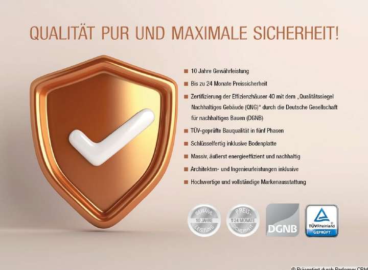Kern-Haus baut individuelle und massive Architektenhäuser zu einem attraktiven Preis-Leistungs-Verhältnis – und das bereits mit einer Erfahrung seit 1980. Bei Kern-Haus erhalten Sie unter anderem 10 Jahre Gewährleistung auf die wesentlichen Bauleistungen, bis zu 24 Monate Preissicherheit sowie eine dokumentierte 5-Phasen-TÜV-Prüfung während der Bauphase. Jedes Kern-Haus als Effizienzhaus 40 ist bereits QNG-zertifiziert durch die Deutsche Gesellschaft für nachhaltiges Bauen (DGNB).