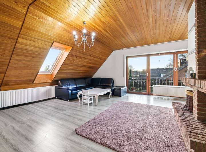 Auch die Wohnung im Obergeschoss bietet zwei Schlafzimmer, ein Vollbad sowie eine Küche inklusive Einbauküche (erneuert im Jahr 2025). Der großzügige Wohnbereich verfügt ebenfalls über einen Kamin und bietet Zugang zu einem geräumigen Süd-West-Balkon. Ein praktischer Abstellraum sowie der Zugang zum Dachboden schaffen zusätzlichen Stauraum. Weitere Nutz- und Abstellflächen stehen Ihnen im Vollkeller zur Verfügung.
