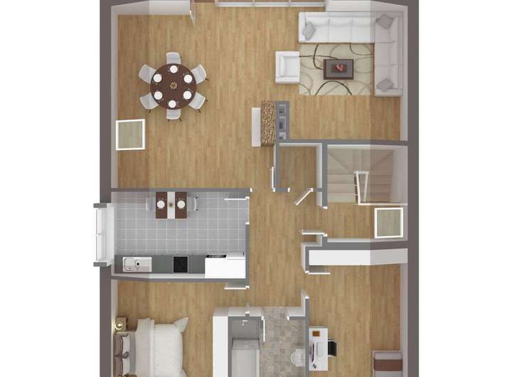Durch die im Obergeschoss befindliche Einliegerwohnung ergeben sich vielseitige Nutzungsmöglichkeiten – von der klassischen Eigennutzung über Mehrgenerationenwohnen bis hin zur Kombination aus Wohnen und Vermietung. Die Raumstruktur ist großzügig angelegt und wird durch hohe Decken zusätzlich unterstrichen.