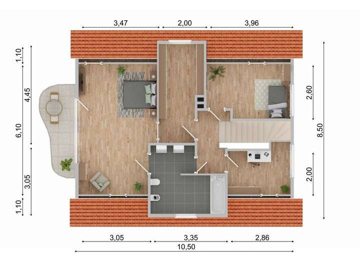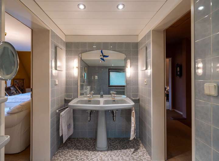 Im Dachgeschoss befinden sich drei Zimmer, die sich hervorragend als Schlaf- und Kinderzimmer nutzen lassen. Das größte Zimmer verfügt über einen direkten Zugang zum Südbalkon. Ein ruhiger Rückzugsort für Eltern. Alle Räume sind über einen zentralen Flur mit einem Badezimmer sowie einem Ankleideraum verbunden. Das helle Vollbad mit Doppelwaschbecken, zwei Toiletten und kombinierter Wannen- und Duschlösung ist besonders auf die Bedürfnisse einer Familie ausgelegt und erleichtert die Morgenroutine spürbar.
