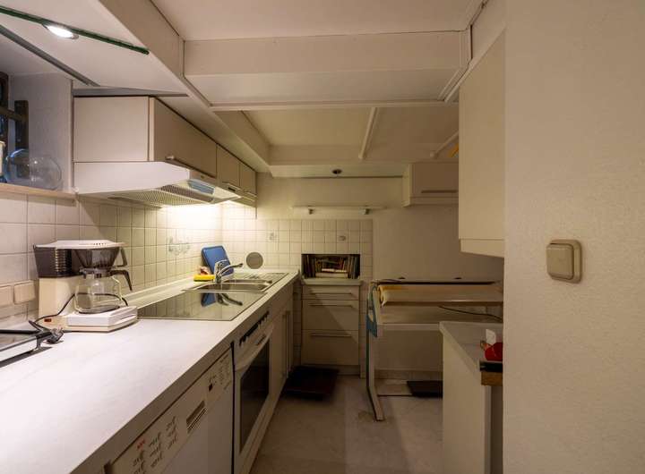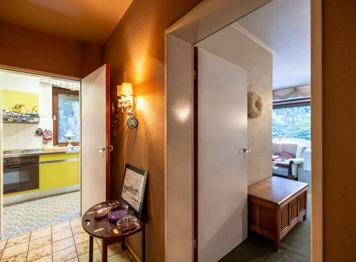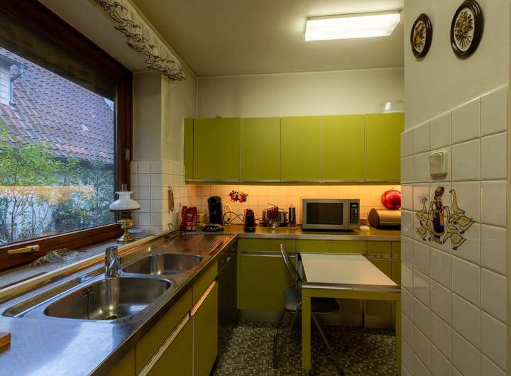 Beim Betreten des Hauses empfängt Sie ein zentraler Flur, der die Räume übersichtlich erschließt. Auf der linken Seite befinden sich eine Garderobe mit Platz für Jacken, Schulranzen und Sportsachen sowie ein separates Gäste-WC. Rechterhand führt die Treppe ins Obergeschoss. Folgt man dem Flur weiter nach links, gelangt man in die Küche im gepflegten Retro-Stil, die den Originalcharakter bewahrt.