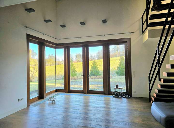 Die Wohnfläche von insgesamt ca. 203m² verteilt sich auf 5,5 Zimmer sowie 2 Bäder, ein Gäste-WC, eine offene Küche mit angrenzendem Essbereich, einen Werkstattraum und ein Fitnesszimmer.