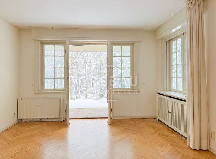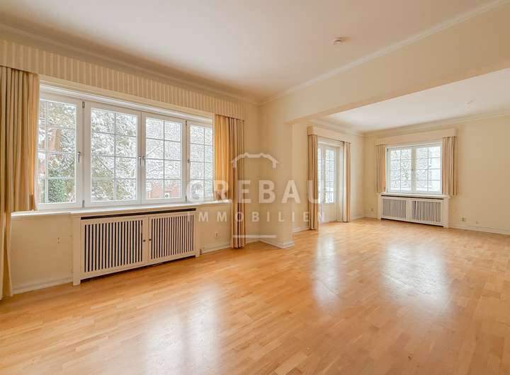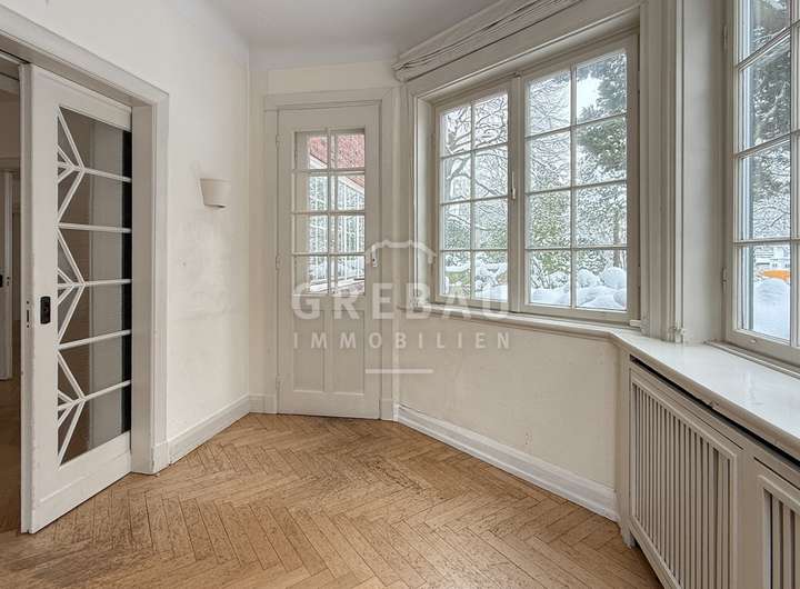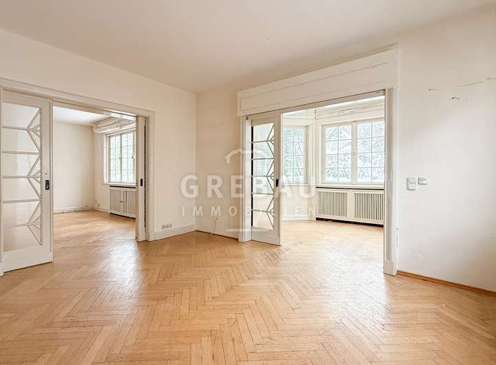 - repräsentative Räumlichkeiten mit großem Eichenfischgrätparkett; Wohn- und Essbereiche sind über große Schiebetüren miteinander verbunden