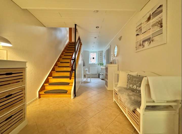 Beim Betreten des Hauses empfängt Sie ein einladender Eingangsbereich, der sofort eine angenehme Wohnatmosphäre vermittelt. Von hier aus gelangen Sie in das Herzstück des Hauses: Der großzügige und modern gestaltete Wohn- und Essbereich lädt zum Verweilen ein. Ebenfalls vom Flur zugänglich sind die Küche, ein Hauswirtschaftsraum sowie der Zugang zum Hinterhof und in den Keller.