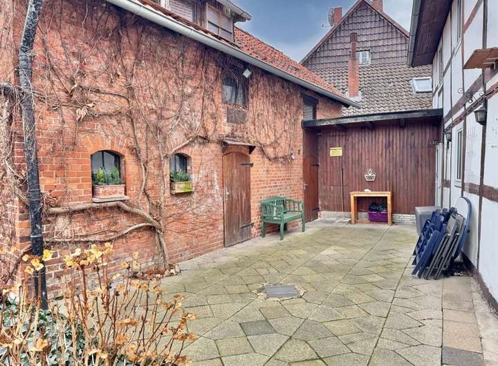 Hinter dem Haus befindet sich ein geschützter Hinterhof sowie eine alte Scheune. Die Scheune ist derzeit nicht nutzbar und weist Sanierungsbedarf auf. Ob Rückbau oder Sanierung – hier eröffnet sich Potenzial für individuelle Ideen.