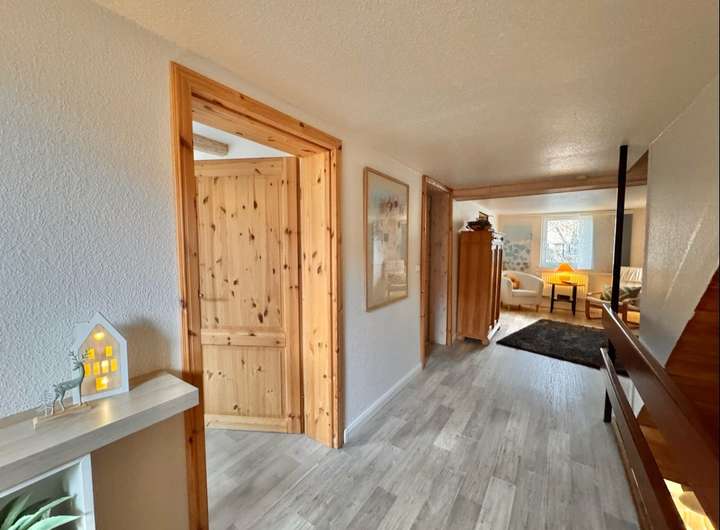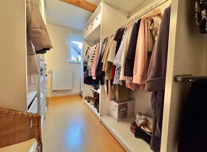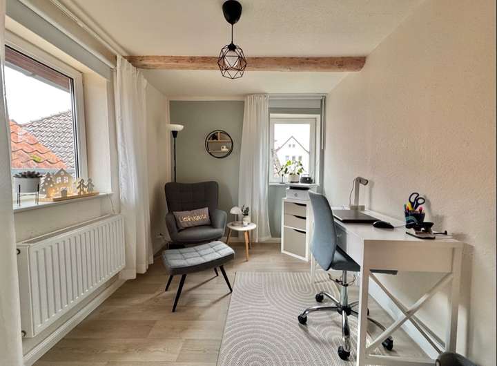 Über eine Holztreppe erreichen Sie das Obergeschoss. Hier stehen Ihnen ein gemütliches Schlafzimmer, ein helles Bürozimmer, ein Kinderzimmer sowie ein Tageslichtbad mit Badewanne und Dusche zur Verfügung. Ergänzt wird die Etage durch ein Ankleidezimmer sowie ein weiteres, ausbaufähiges Kinderzimmer, das zusätzliche Gestaltungsmöglichkeiten bietet.