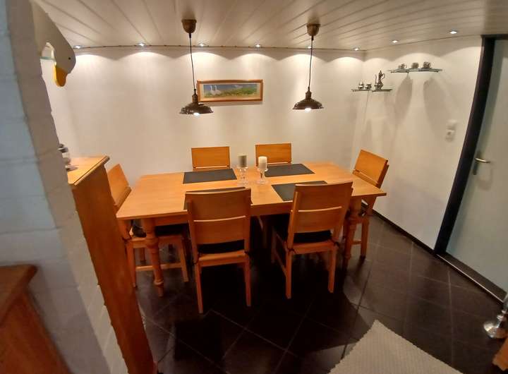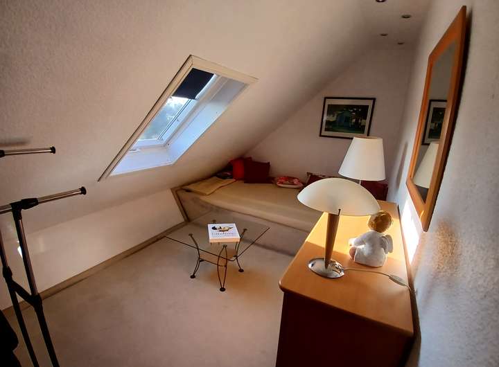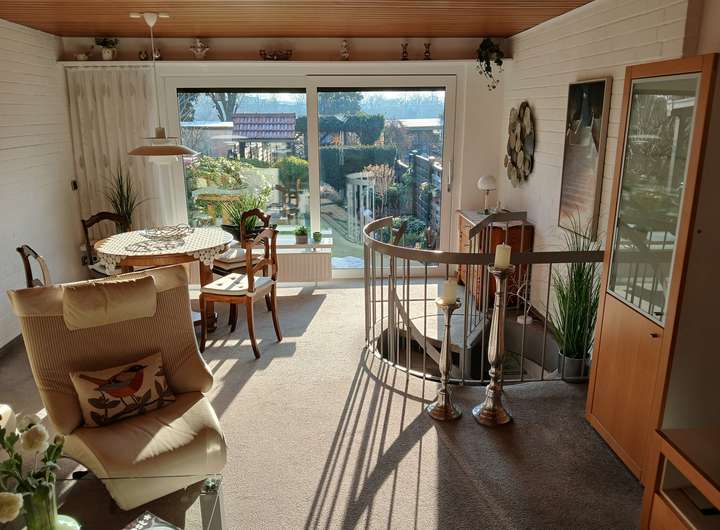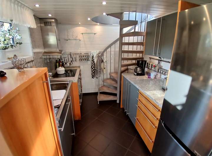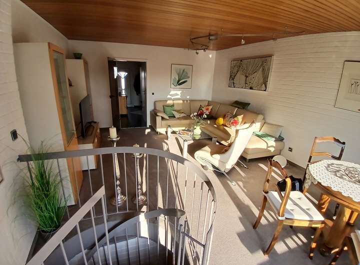 Besonders hervorzuheben ist die pfiffig gestaltete Raumaufteilung. Durch einen integrierten Anbau wurde das Wohnzimmer großzügig erweitert. Gleichzeitig wurde ein geräumiger Eingangsbereich inkl. Gäste-WC geschaffen, in dem die Küche in den Kellerbereich verlegt wurde. Die Küche ist somit über eine geschmackvolle Wendeltreppe vom Wohnzimmer zu erreichen.