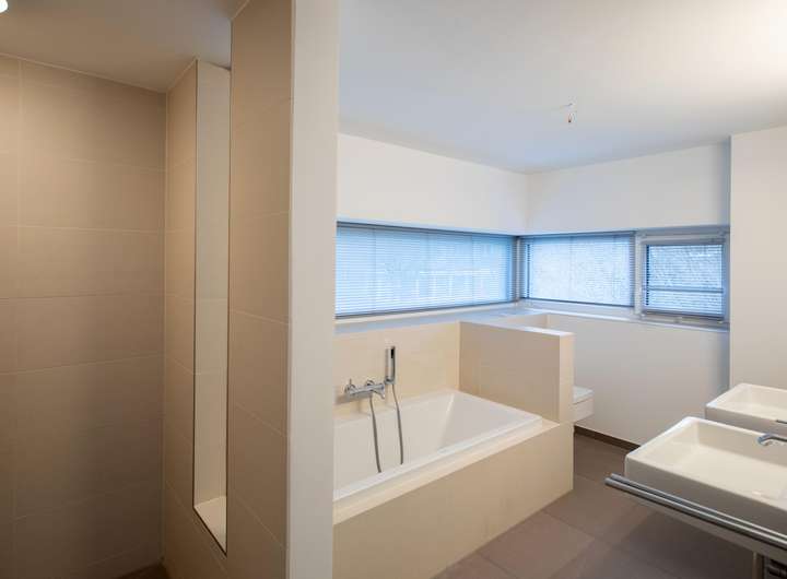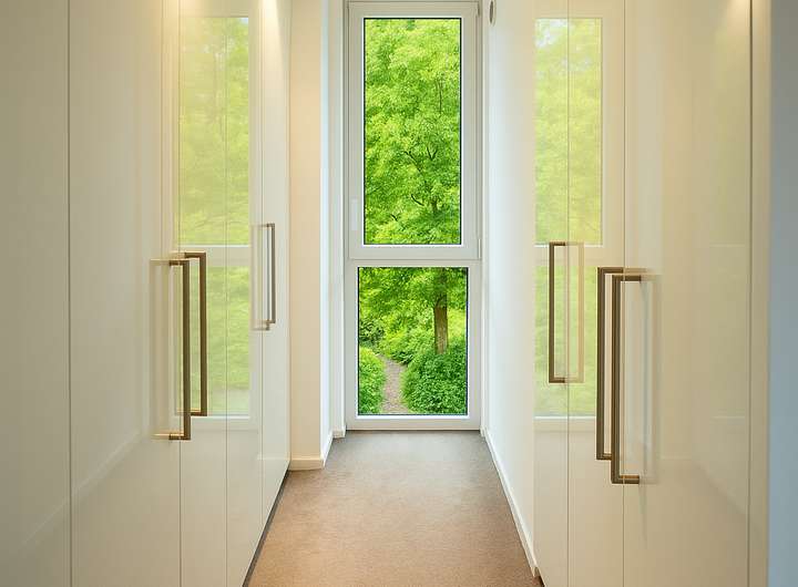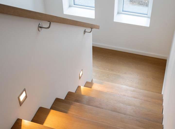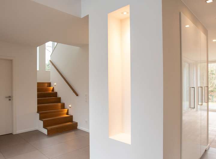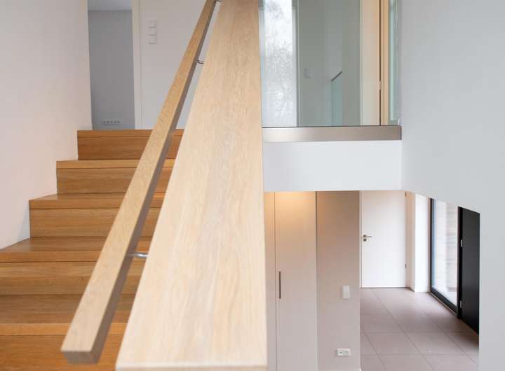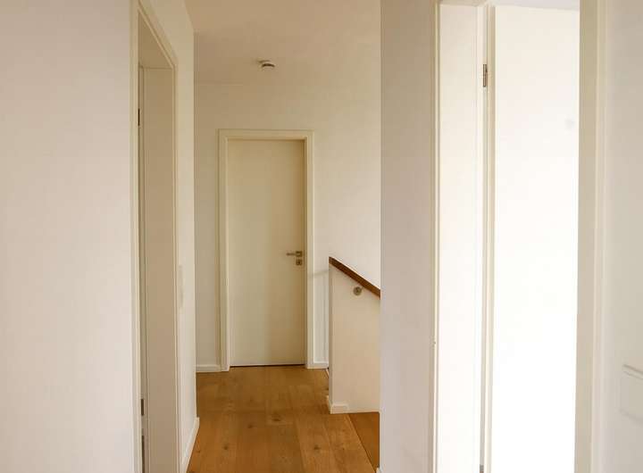 Der Komfort dieses Hauses erschließt sich im Detail. Der KfW-70-Standard, eine effiziente Kombination aus Solar und Erdgas sowie eine kontrollierte Be- und Entlüftungsanlage sorgen für ein Raumklima, das man nicht hört, aber spürt. Es ist die technische Intelligenz, die im Hintergrund bleibt, um den Alltag reibungslos zu begleiten.