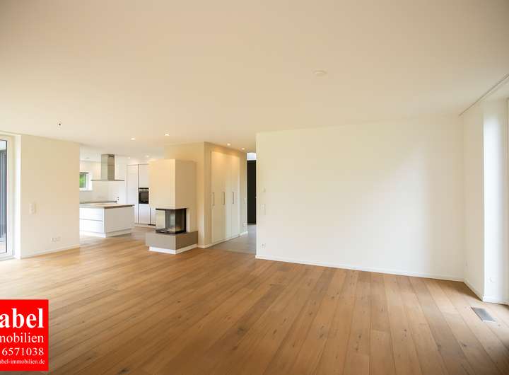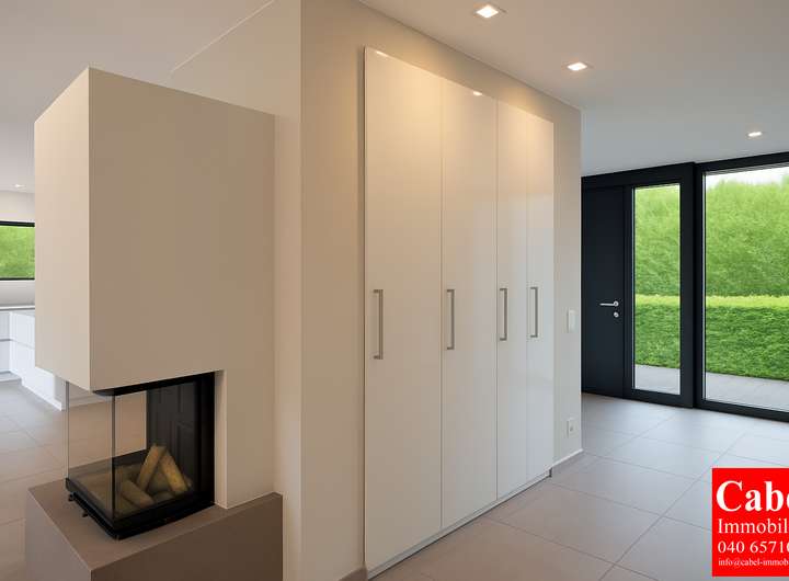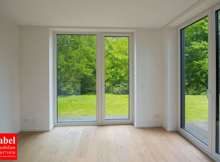 Die Architektur folgt dem Prinzip der Klarheit. Auf ca. 180m² Wohnfläche entfaltet sich eine Struktur, die keine Ablenkung sucht, sondern Ruhe bietet. Ein großzügiges Entrée führt in den Wohn- und Essbereich, in dem deckenhohe Glaselemente den Blick auf das Wesentliche freigeben: Licht und das Grün des Grundstücks.