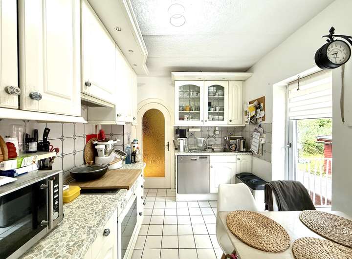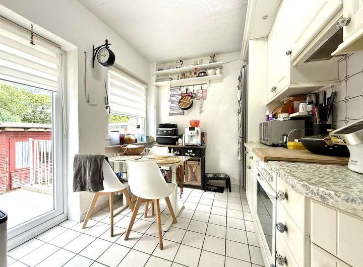 Die angrenzende Küche ist funktional ausgestattet und verfügt über Ober- und Unterschränke sowie Elektrogeräte unter anderem der Marken Bosch und AEG. Von hier aus gelangt man direkt in den hinteren Gartenbereich, der Platz für eine weitere Sitzecke und einen Grillbereich bietet.