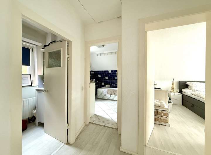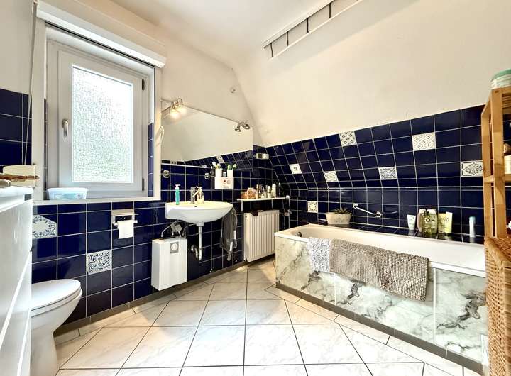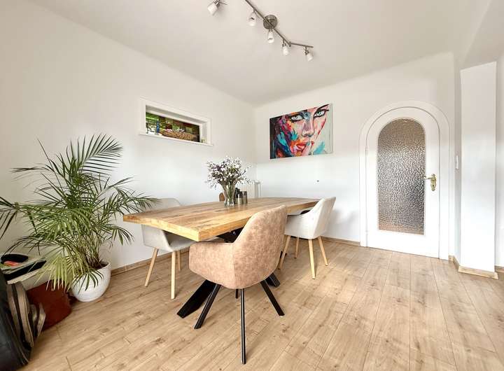 Im Wohn- und Eingangsbereich wurde im Jahr 2021 ein pflegeleichter Vinylboden in Holzoptik verlegt, während Diele, Küche und Gäste-WC mit zeitlosen Fliesen ausgestattet sind.