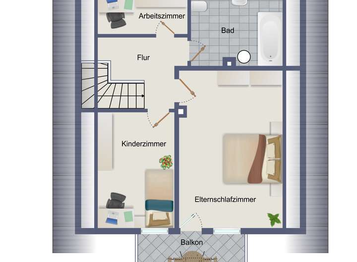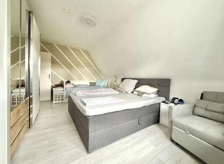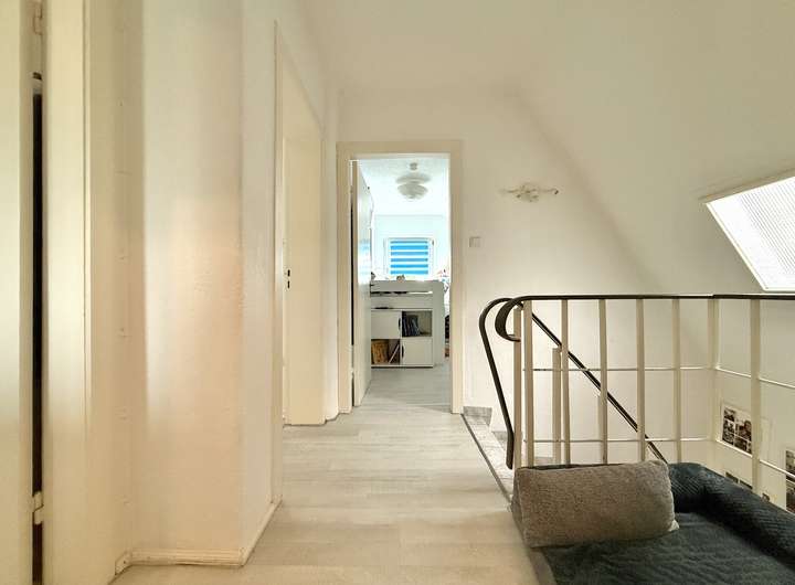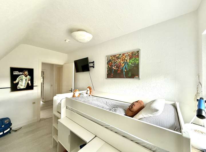 Über eine geflieste Betontreppe erreicht man das Obergeschoss. Hier stehen ein Arbeitszimmer, ein Kinderzimmer, ein großzügiges Schlafzimmer sowie ein Wannenbad mit WC und Waschbecken zur Verfügung. Die Fenster sind mit manuellen Außenrollläden ausgestattet und ermöglichen eine gute Verdunkelung.