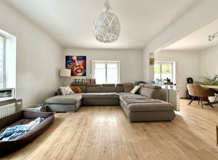 Das großzügige Wohn- und Esszimmer überzeugt durch große Fensterflächen, die einen schönen Blick auf die Terrasse und den Garten ermöglichen und für eine angenehme Lichtdurchflutung sorgen. Der Raum bietet ausreichend Platz für eine gemütliche Wohnlandschaft, einen Esstisch sowie zusätzliche Möbel. Außenrollläden sorgen für zusätzlichen Wohnkomfort.