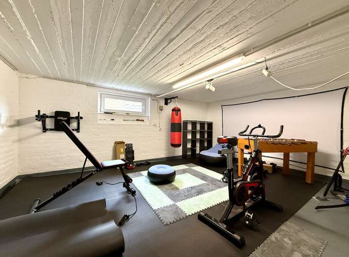 Der Vollkeller bietet neben einem Waschmaschinen- und Trocknerbereich einen weiteren Raum mit modernisiertem Fenster, der sich vielseitig nutzen lässt, beispielsweise als Hobby- oder Fitnessraum.