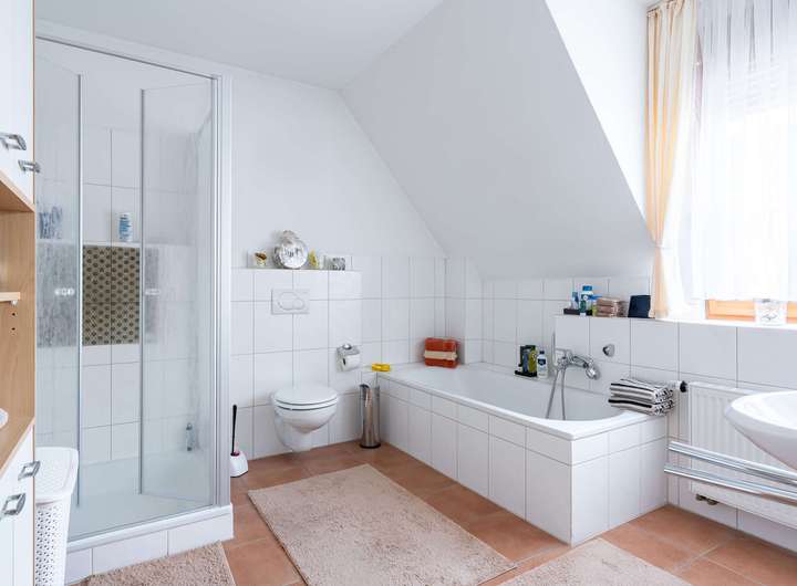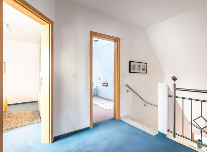 Das Obergeschoss verfügt über drei gut geschnittene Schlafzimmer, die sich flexibel als Kinder-, Arbeits- oder Gästezimmer nutzen lassen. Das helle Badezimmer ist hochwertig ausgestattet mit Dusche, Badewanne sowie einer Fußbodenheizung und bietet damit ein hohes Maß an Wohnkomfort.