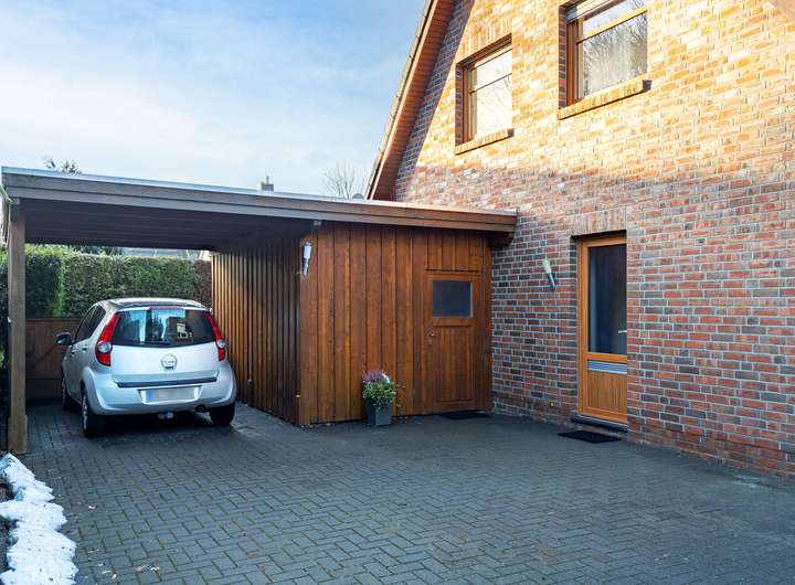 Zusätzlichen Stauraum bietet der Spitzboden. Im Außenbereich stehen ein Carport sowie ein separater Schuppen zur Verfügung, ideal für Fahrräder, Gartengeräte oder Hobbybedarf. Die Terrasse und der Garten laden zum Entspannen, Spielen oder zu geselligen Stunden im Freien ein.