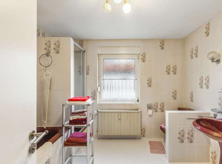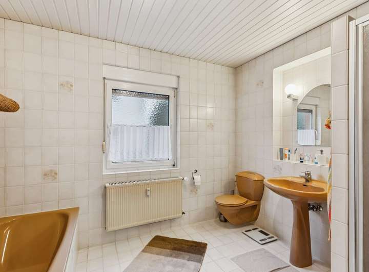 Das Tageslichtbad ist großzügig dimensioniert und mit Badewanne sowie separater Dusche ausgestattet. Wand- und Bodenflächen sind mit keramischen Fliesen in typischer Gestaltung ihrer Entstehungszeit versehen, die sich in einem gepflegten Zustand befinden. Ein Fenster sorgt für natürliche Belichtung und Lüftung.