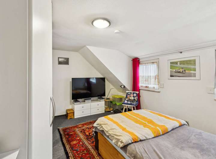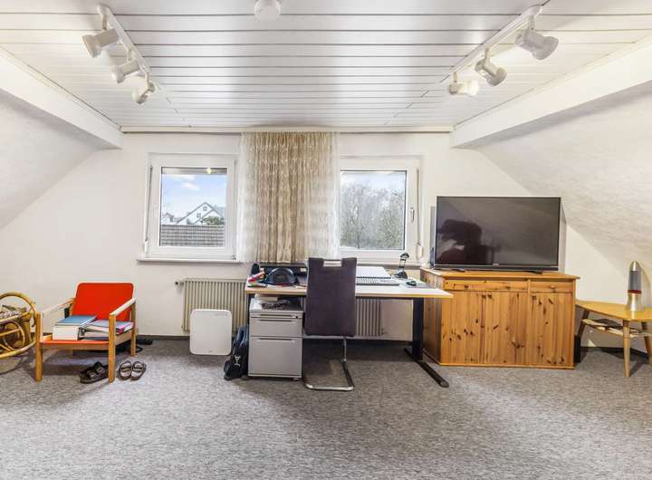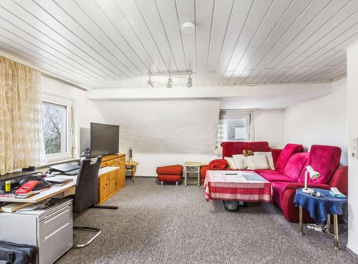 Die Dachgeschosswohnung verfügt über einen eigenständigen, wohnlichen Charakter, der insbesondere durch die vorhandenen Dachschrägen geprägt wird. Das Wohnzimmer ist großzügig geschnitten und bietet trotz der Schrägen ausreichend Stellfläche. Der vorhandene Teppichboden unterstreicht den funktionalen Charakter der Einheit und kann bei Bedarf individuell erneuert oder modernisiert werden.
