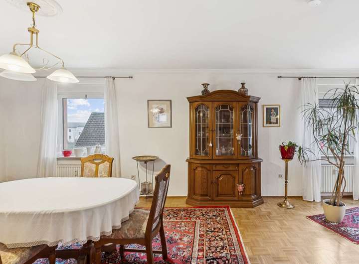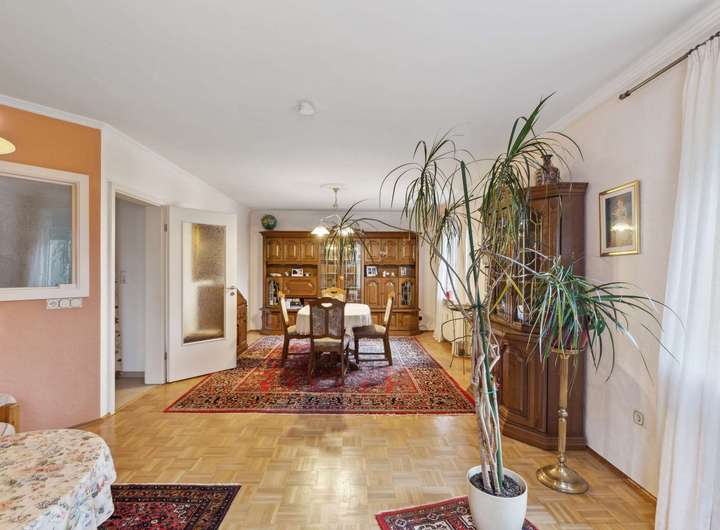 Das Wohnzimmer präsentiert sich großzügig geschnitten und bietet durch mehrere Fenster eine gute natürliche Belichtung. Der Raum lässt sich flexibel möblieren und verbindet Wohnen und Essen auf harmonische Weise. Der klassische Parkettboden unterstreicht den gepflegten Gesamteindruck.