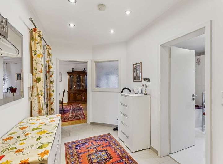 Die Wohnung im Obergeschoss empfängt mit einem klar strukturierten Eingangsbereich, der durch eine dezente Deckenbeleuchtung angenehm und funktional ausgeleuchtet ist. Von hier aus sind alle Räume gut erreichbar, was den Grundriss übersichtlich und alltagstauglich macht.