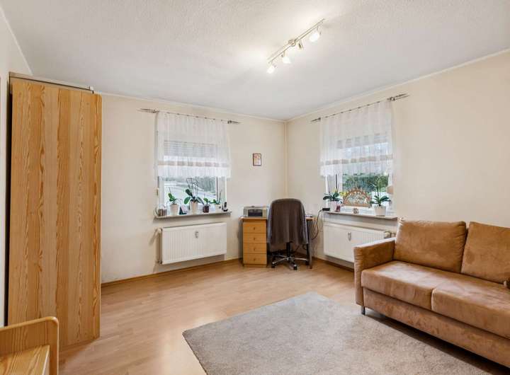 Das Schlafzimmer ist ruhig gelegen und mit einem hellen Laminatboden versehen, der auch in den übrigen Wohnräumen verwendet wird und für ein einheitliches Erscheinungsbild sorgt. Ein weiteres Zimmer eignet sich flexibel als Kinder-, Gäste- oder Arbeitszimmer und profitiert durch zwei Fenster von einem guten Tageslichteinfall aus unterschiedlichen Himmelsrichtungen.