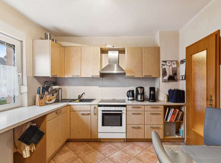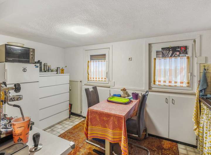 Die Küche ist kompakt und zweckmäßig gestaltet. Zwei Fenster sorgen für ausreichend Tageslicht und eine gute Belüftung. Die Ausstattung entspricht einem einfachen, gepflegten Standard und bietet eine solide Basis für eine spätere Modernisierung.
