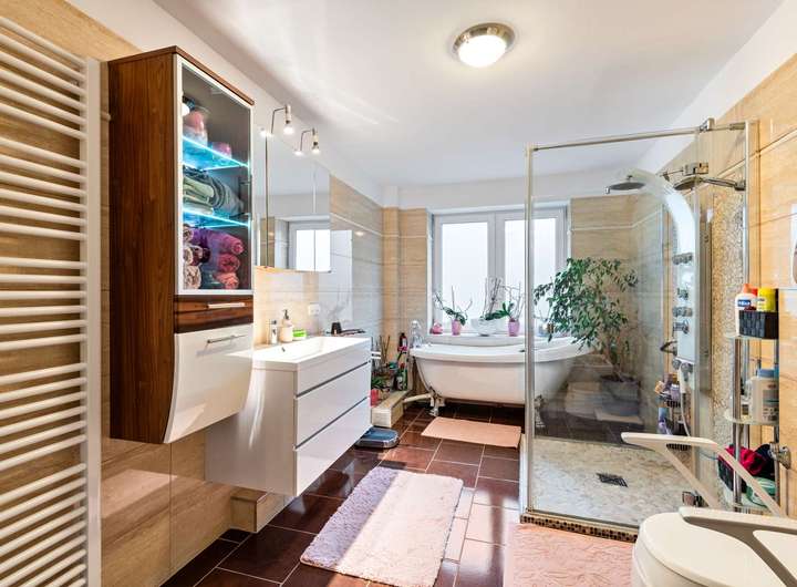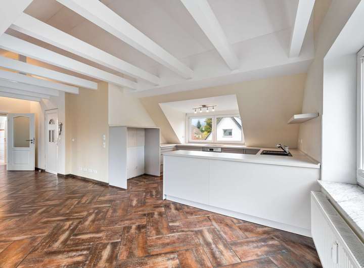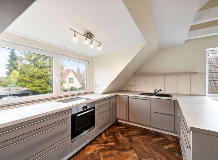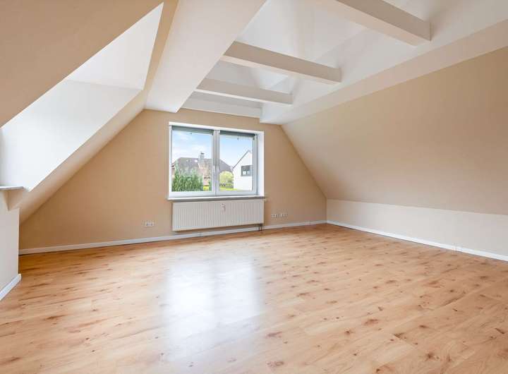 Das Obergeschoss setzt den freundlichen Eindruck fort und überrascht trotz Dachschrägen mit luftigem Wohngefühl. Bodentiefe Fenster und eine großzügige Gaube holen viel Licht in den Wohn- und Essbereich, der nach Süden ausgerichtet ist und eine warme, offene Atmosphäre schafft. Zwei Schlafzimmer - eines nach Nordosten, das andere nach Nordwesten - bieten Ruhe und Rückzugsmöglichkeiten. Die große Westterrasse schließt an den Wohnbereich an und lädt zu sonnigen Nachmittagen und entspannten Abenden ein.