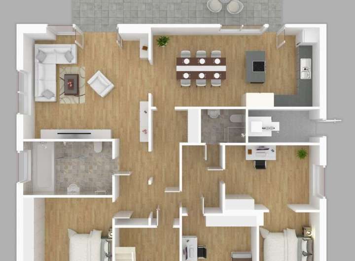 Die untere Wohneinheit im Erdgeschoss öffnet sich durch große Fensterflächen nach Westen und präsentiert einen hellen, einladenden Wohn- und Essbereich mit moderner Einbauküche. Zwei Schlafzimmer mit östlicher Ausrichtung profitieren von viel Morgenlicht. Ein Arbeitszimmer nach Norden ist direkt mit einem weiteren Schlafzimmer verbunden, das ebenfalls nach Osten zeigt und sich flexibel nutzen lässt. Ein voll ausgestattetes Badezimmer sowie ein separates Gäste-WC ergänzen das Raumangebot dieser Etage.