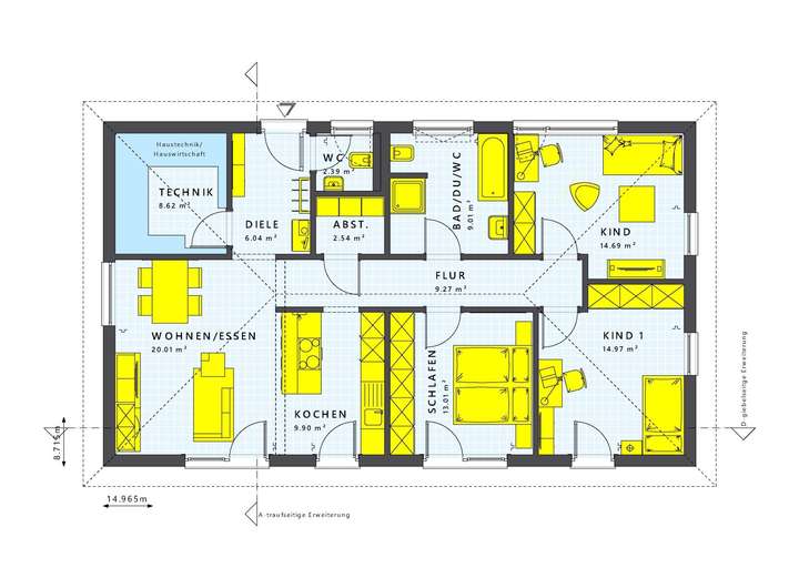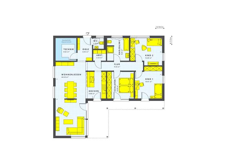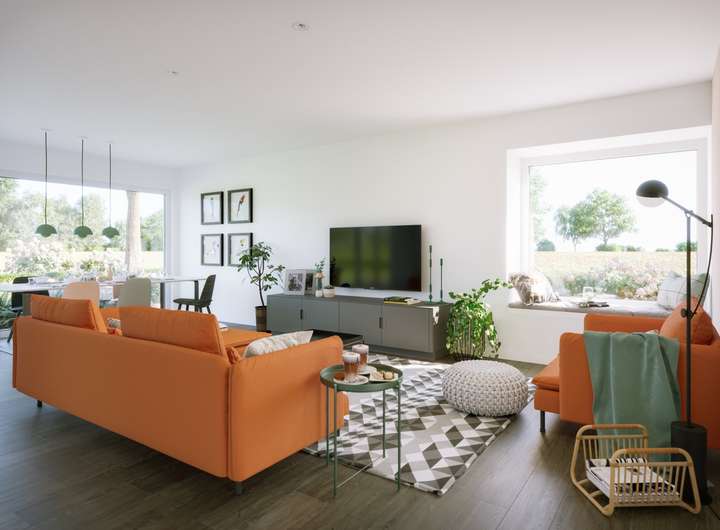 Moderne Wärmepumpentechnik mit Komfortlüftung sorgt für ein angenehmes Raumklima und niedrige Energiekosten. Aluminiumgeschäumte Rollläden bieten im Sommer Hitzeschutz und tragen im Winter zur Wärmedämmung bei. Du kannst dich auf eine individuelle Gestaltung deines Innenausbaus freuen, wobei du auch Baustrom- und Bauwasseranschlüsse über Living Haus organisieren lassen kannst.