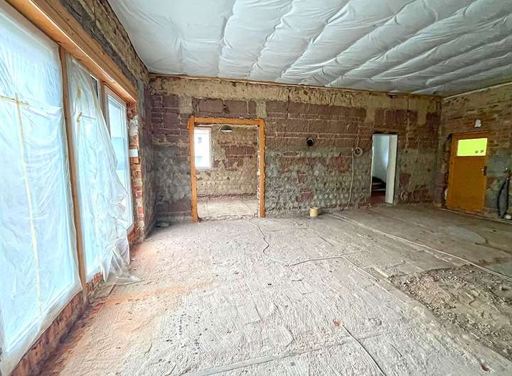 Die TE 3 liegt überwiegend im Anbau sowie im Haupthaus. Die TE Nr. 3 wurde entkernt und zur Sanierung vorbereitet, keine Heizung und Sanitärausstattung, Rohbauzustand, Nutzfläche lt. Teilungserklärung ca. 82,70 m². Die Einheit umfasst einen Hauptraum, ein Zimmer und einen kleinen Aufgang der zu einem Abstellraum (Haupthaus) führt. Überdachte Veranda mit Zugang zur Einheit. Laut Teilungserklärung ist der Einheit die Gartenfläche Nr.2 x 3SG (augenscheinlich Dachfläche der Garagen) sowie die Fläche 3 SG vor dem Haus (augenscheinlich Außenstellplätze) mit Sondernutzungsrecht zugeordnet. Ebenfalls gehören die Kellerräume zur Einheit.