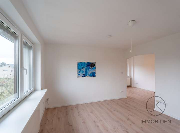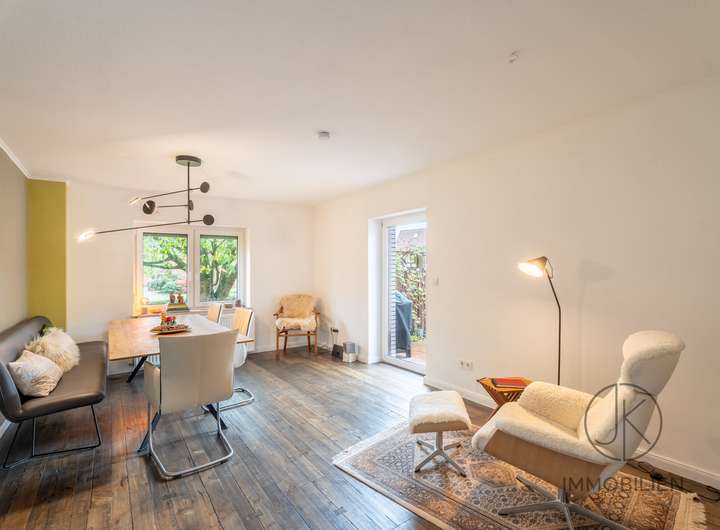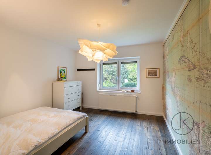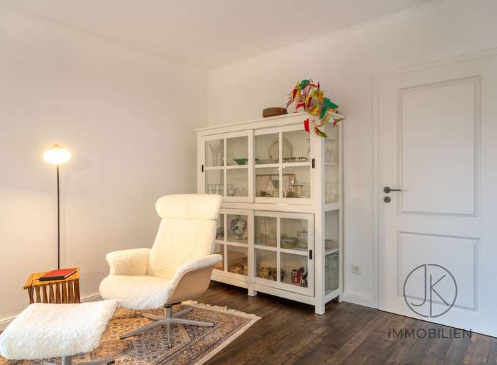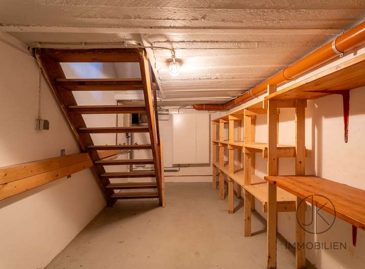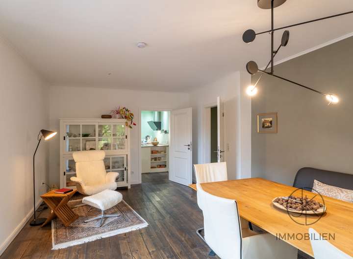 Die Erdgeschosswohnung umfasst drei Zimmer, ein Wohnzimmer und zwei Schlafzimmer, sowie eine separate Küche, ein Badezimmer und ein Gäste-WC. Ergänzt wird diese Einheit durch einen Teilkeller. In den letzten Jahren wurde das Erdgeschoss gezielt aufgewertet, unter anderem durch den Einbau einer neuen Küche, hochwertige Bodenbeläge sowie erneuerte Innentüren.