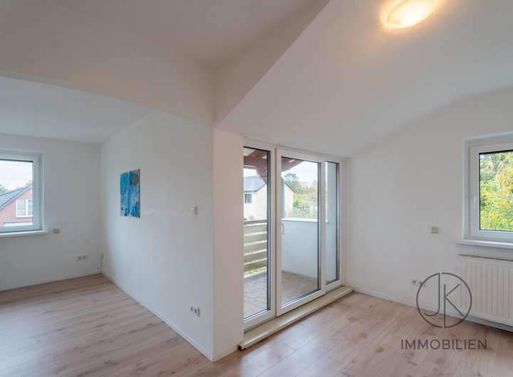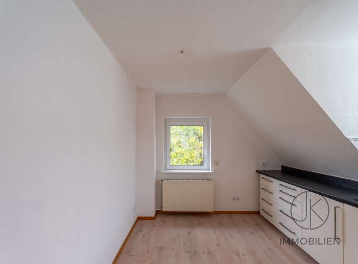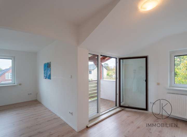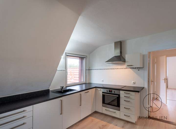 Die Dachgeschosswohnung besteht aus einem Wohnzimmer mit Zugang zum Balkon, einem Schlafzimmer, einer separaten Küche und einem Badezimmer. Auch diese Einheit ist vollständig eigenständig nutzbar und technisch klar getrennt ausgeführt.