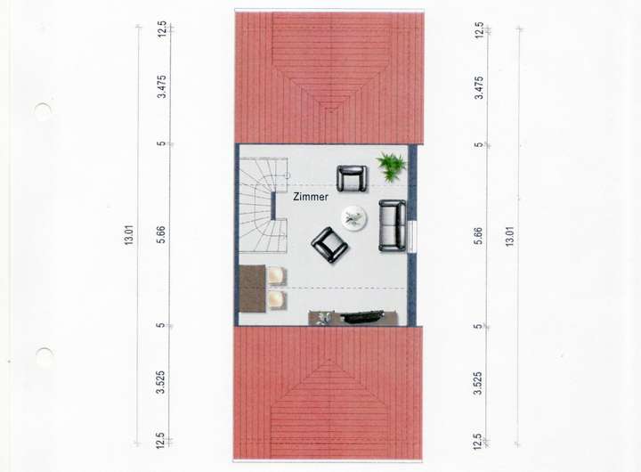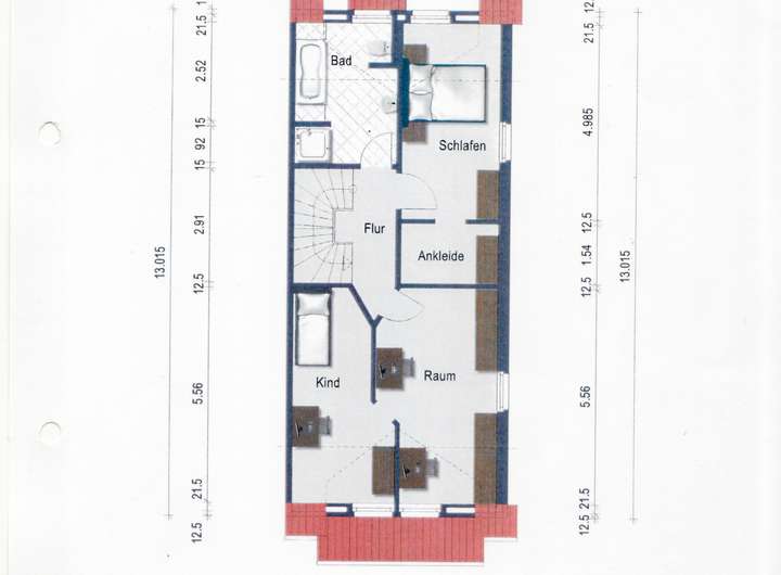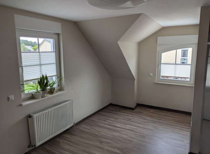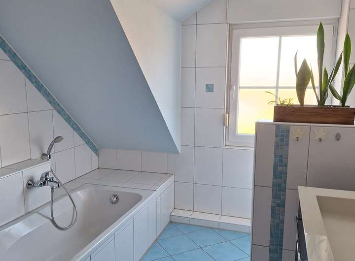 Über eine offene Holztreppe erreichen sie das 1. OG. Hier befinden sich 2 Schlafzimmer sowie das Badezimmer mit Wanne und Dusche. Da zwei Zimmer zusammengelegt wurden, können bei Bedarf problemlos auch 3 Schlafzimmer im 1. OG geschaffen werden. Im voll gedämmten Dachgeschoß befindet sich ein Studio das als weiteres Kinderzimmer, Gästezimmer oder Büro genutzt werden kann.