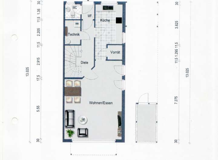 Sie betreten das Haus über einen kleinen Windfang mit Zugang zum Gäste-WC. Vom Flur haben sie Zugang zu Küche, Wohn-Esszimmer mit Blick in den eigenen Garten, zum Technik/Abstellraum und Treppenaufgang. Von der Küche gelangen sie in den Vorratsraum und vom großzügigen Wohnzimmer über ein großes Schiebeelement in den Wintergarten.