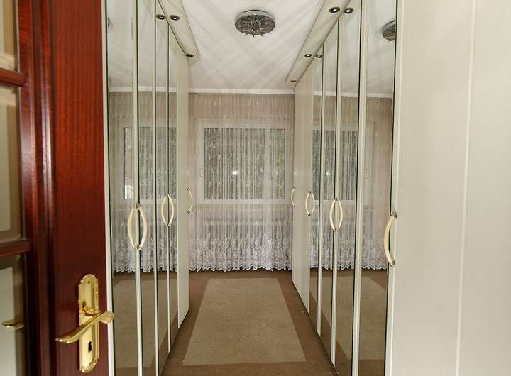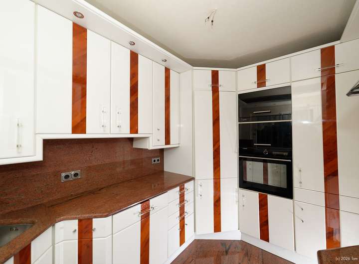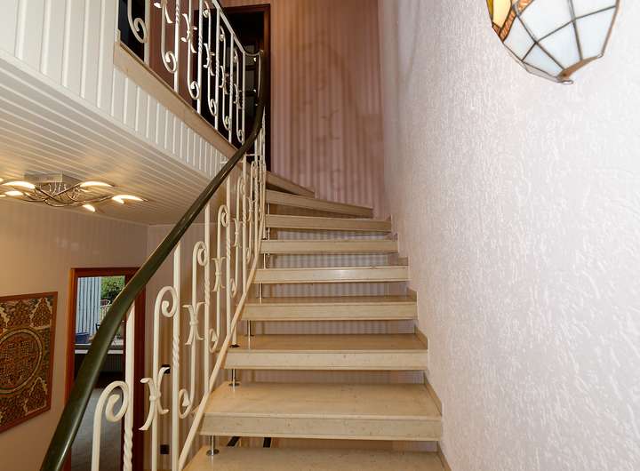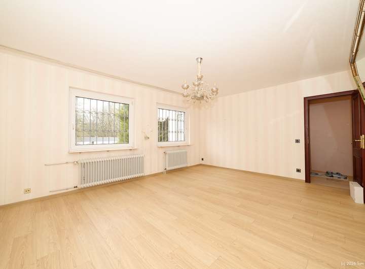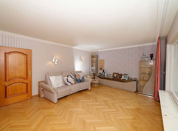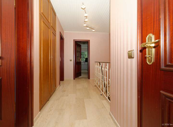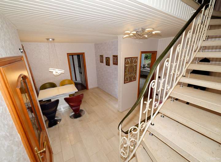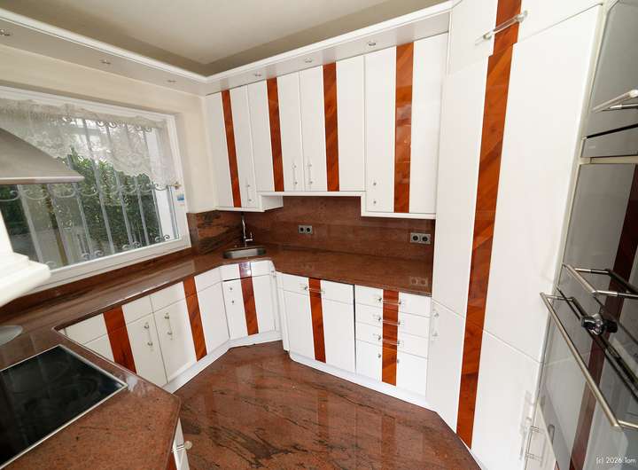 Elegante Marmorfußböden im Eingangs- und Essbereich, eine Marmortreppe vom Keller bis ins Obergeschoss und Fischgrätenparket im Wohnzimmer verleihen dem Haus eine besondere Anmutung. In der Küche sind Boden und Arbeitsplatte aus dem gleichen Granit wie er im Eingangsbereich verwendet wurde. Im Obergeschoss wartet ein Balkon auf Sie, der bei einigen Nachbarhäusern in einen Wintergarten umgewandelt wurde.