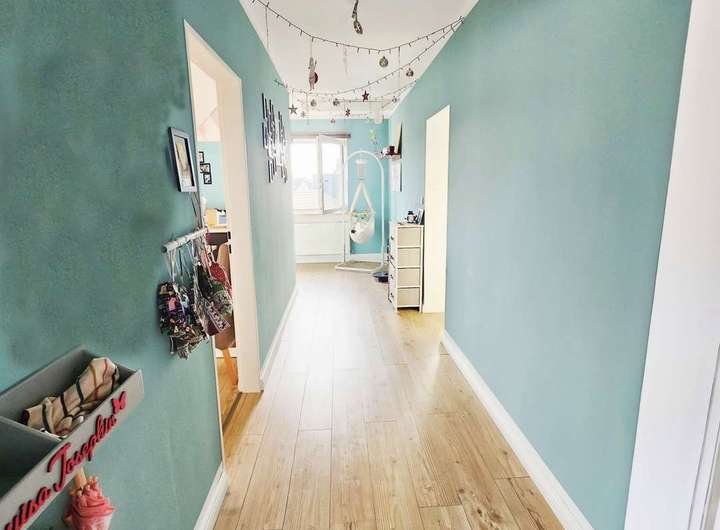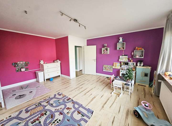 Über wenige Stufen gelangt man in die Wohnung. Der Flur verbindet alle Räume: ein Büro/Gästezimmer, ein modernes Bad mit Dusche, Badewanne und Waschmaschinenanschluss, ein großer Küchen‑/Essbereich mit Einbauküche sowie ein Wohnzimmer, Schlafzimmer und Kinderzimmer.