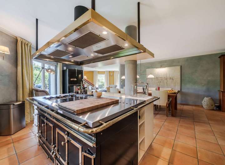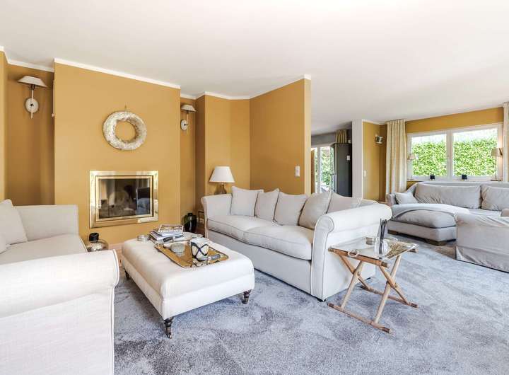 - Lichtdurchfluteter Wohnbereich mit Kamin, offene Küche mit Kochinsel