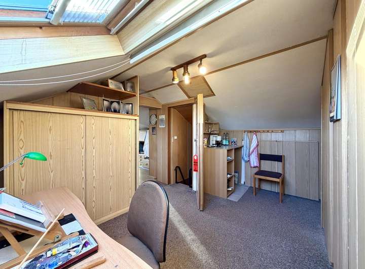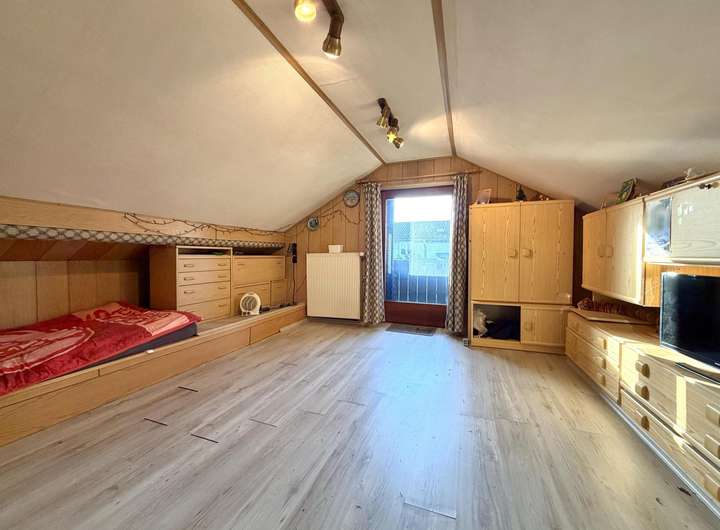 Das Dachgeschoss wurde ausgebaut, sodass es derzeit zwei Zimmer mit einer Dusche, einem Waschtisch sowie einem Balkon bietet.