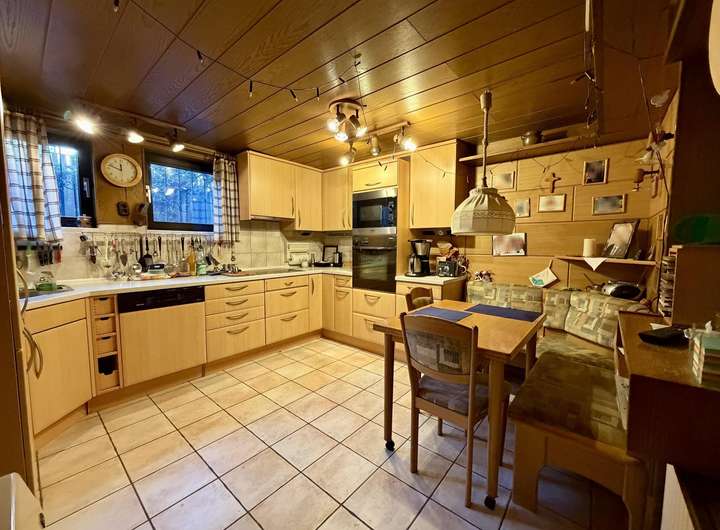 Die Küche befindet sich derzeit im Untergeschoss. Es besteht jedoch die Möglichkeit, diese in das Esszimmer im Erdgeschoss zu integrieren.