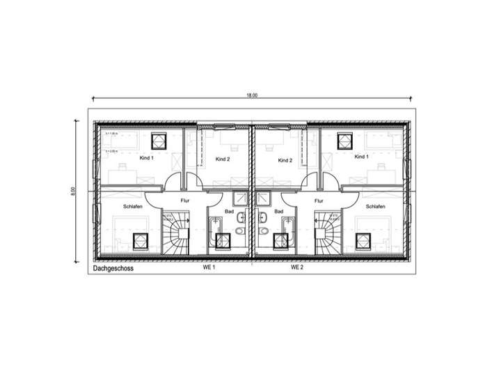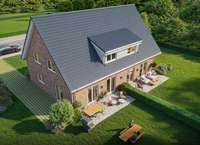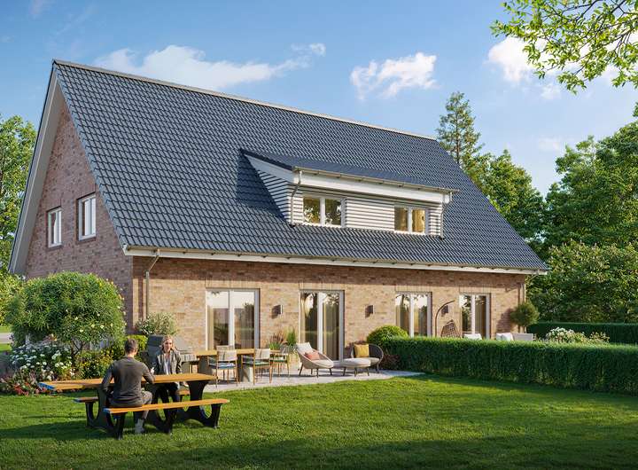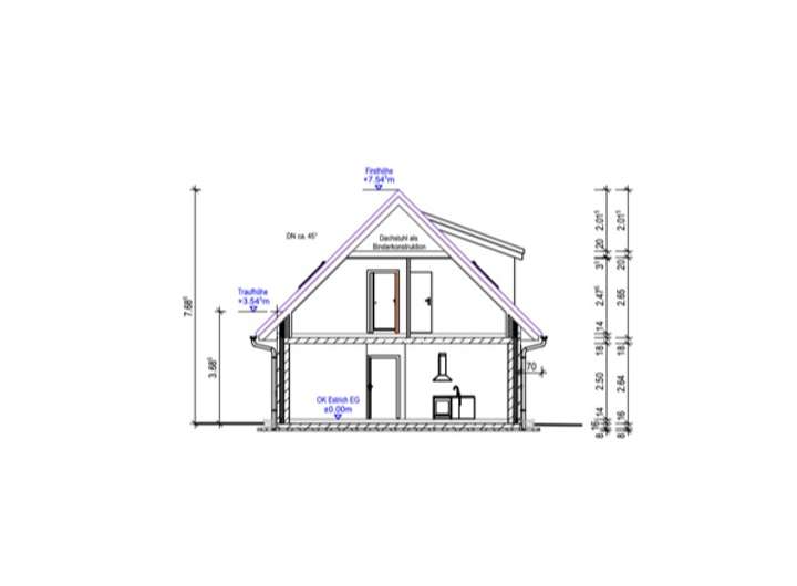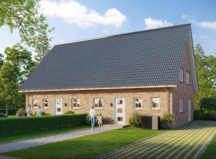 Es handelt sich um ein Neubau-Doppelhaus in Massivbauweise mit klassischem Satteldach, geplant nach den Vorgaben des Gebäudeenergiegesetzes (GEG). Je Wohneinheit erstrecken sich zwei Ebenen mit Wohnen/Essen im Erdgeschoss und drei Schlafräumen im Dachgeschoss; moderne Haustechnik wie Luft-Wasser-Wärmepumpe, kontrollierte Be-/Entlüftung und 3-fach-Verglasung ist vorgesehen.