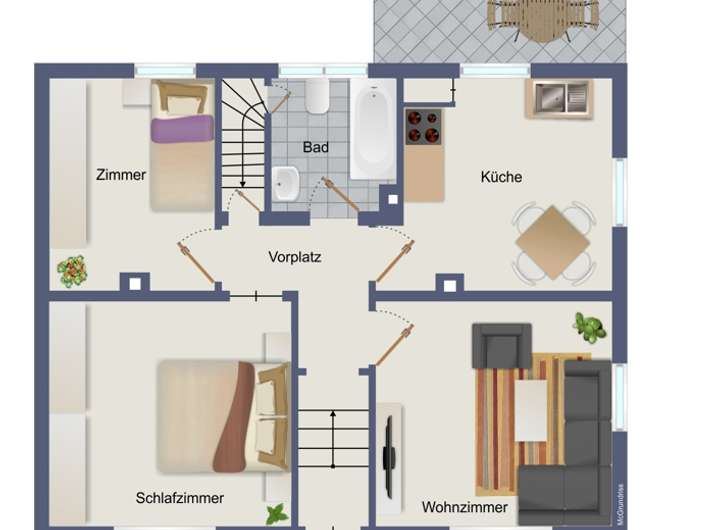 Im Erdgeschoss erwarten Sie eine gemütliche (Wohn-) Küche mit Zugang zur Terrasse, ein Wohnzimmer, zwei Schlafzimmer sowie ein Tageslichtbad mit Wanne.