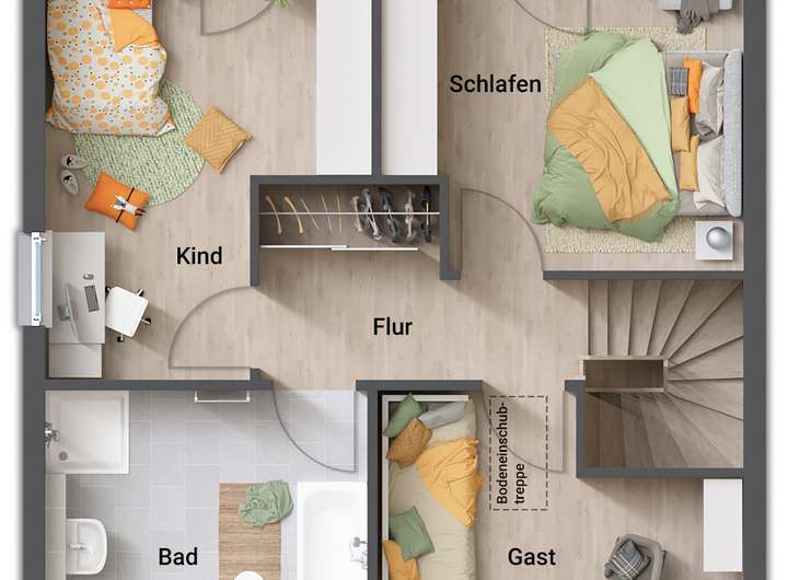 • Fußbodenheizung: Warme Füße? Auch die Fußbodenheizung ist inklusive. Sie steigert nicht nur den Wert Ihres Hauses, sondern sorgt ganz nebenbei noch für echtes Wohngefühl.