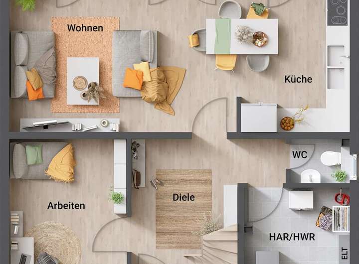• Fußbodenheizung: Warme Füße? Auch die Fußbodenheizung ist inklusive. Sie steigert nicht nur den Wert Ihres Hauses, sondern sorgt ganz nebenbei noch für echtes Wohngefühl.