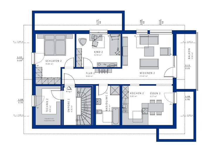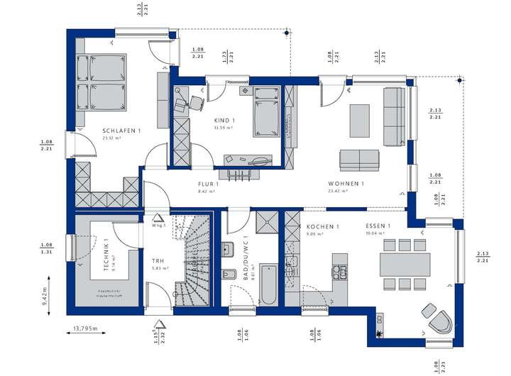Die durchdachte Architektur des CELEBRATION 211 erlaubt es Ihnen, Ihre Wohnträume zu verwirklichen. Sie genießen nicht nur den Komfort eines eigenen Wellness-Bades, sondern auch einen Balkon, der Ihnen die Möglichkeit gibt, die frische Luft und die Aussicht auf Ihren Garten zu genießen. Die lichtdurchfluteten Räume schaffen eine angenehme Atmosphäre, die zum Entspannen einlädt. Zudem sorgt ein eigener Technikraum für praktische Lösungen im Alltag, was besonders für Familien von Vorteil ist.