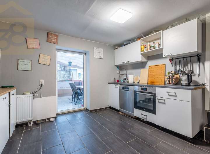 Im Erdgeschoss des Haupthauses empfängt ein zentraler Flur die Bewohner und Besucher. Links vom Flur liegt das Badezimmer, das mit Badewanne und einem Fenster ausgestattet ist und somit Tageslicht und gute Belüftung bietet. Die Küche verfügt über eine vorhandene Einbauküche und bietet ausreichend Platz für den täglichen Bedarf. Von hier aus ist auch die Terrasse mit angrenzendem Garten zugänglich, die zu entspannten Stunden im Freien einlädt. Das Wohnzimmer bildet das Herzstück des Hauses und bietet einen direkten Zugang zu einem Schlafzimmer, wodurch sich dieser Bereich auch gut als Elternbereich nutzen lässt. Ergänzend steht im Erdgeschoss ein praktischer Abstellraum zur Verfügung.