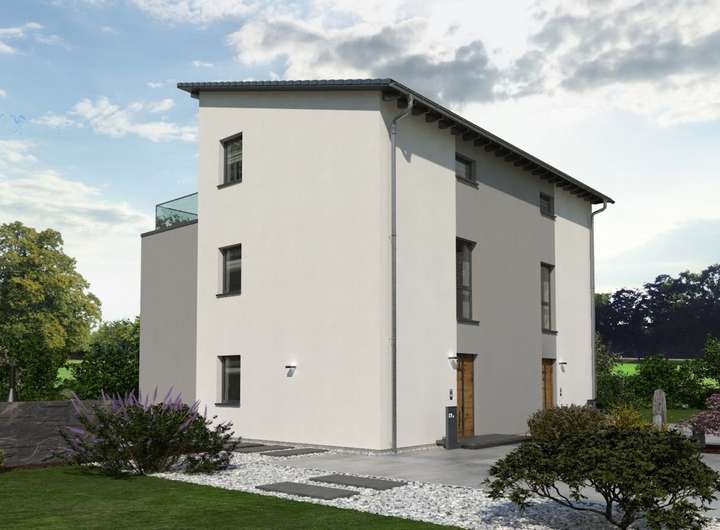 Eine geringe Grundfläche bei maximalem Wohnkomfort - das bietet unser Doppelhaus 08 und eignet sich damit perfekt für kleine Grundstücke. Das dreigeschossige Gebäude mit Pultdach überzeugt nicht nur durch sein durchdachtes Raumkonzept, sondern auch mit einer außergewöhnlichen Architektur, die sich bereits in der Fassadengestaltung zeigt: Durch die symmetrische Bauweise mit einem erkerartigen Vorsprung, der die beiden baugleichen Wohneinheiten optisch voneinander trennt, entstehen im zweiten Obergeschoss sichtgeschützte Balkone, die nach einem anstrengenden Tag zum Relaxen einladen. Ein Ort zum Zusammenkommen, Kochen, Austauschen und Genießen ist das Erdgeschoss mit offenem Wohn-Ess-Koch-Bereich. Zudem im Parterre: HAR, HWR und Gäste-WC. Das erste Obergeschoss ist zugleich das Reich der Kinder: Zwei Zimmer und ein großes Bad stehen hier zur Verfügung. Unter dem Pultdach haben die Eltern ihren Rückzugsort - mit Schlaf- und Arbeitszimmer und direktem Zugang zum Balkon. Mehr Wohnen geht nicht.