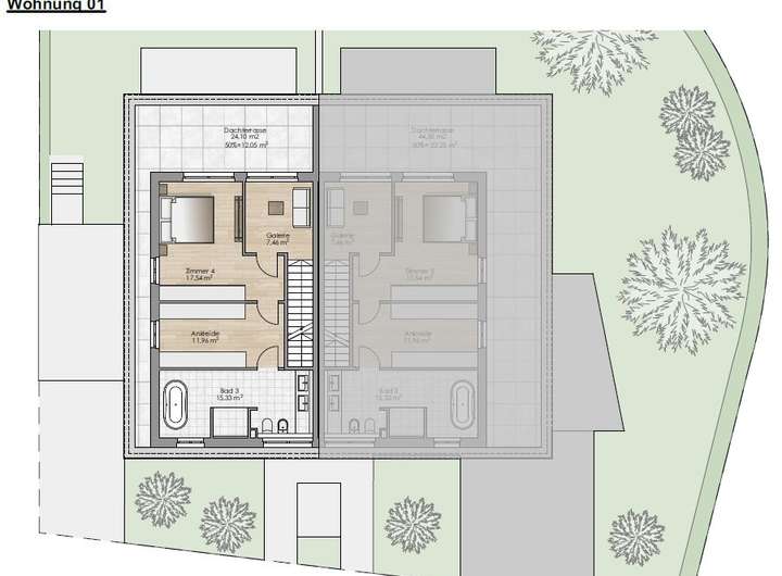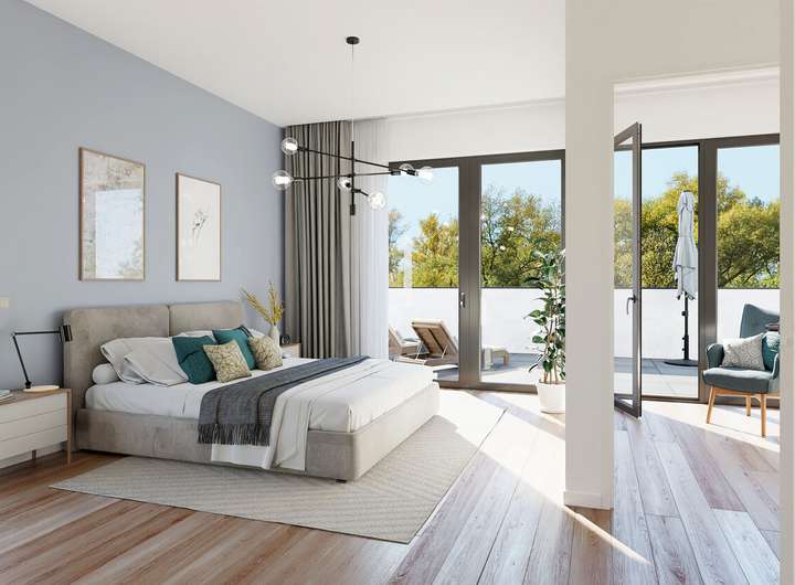 Über eine weitere gerade Treppe gelangen Sie in das Staffelgeschoss. Dort befindet sich ein Galeriebereich, der sich hervorragend als gemütlicher Lesebereich/Arbeitsbereich eignet. Direkt angeschlossen ist das Elternschlafzimmer, von welchem Sie auch auf die 24 m² große Dachterrasse gelangen. Anschließend an das Schlafzimmer haben wir noch eine geräumige Ankleide. Ein weiteres Highlight ist das über 15 m² große Badezimmer, das keine Wünsche offenlässt.